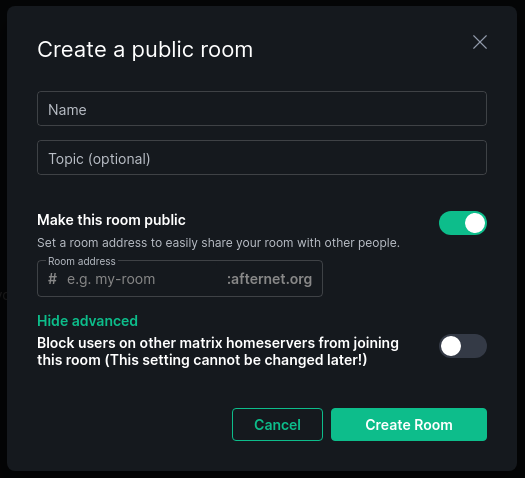 If you create a room from the Room Explorer the following screen appears as it will assume its a public room, it allows you to set the room name, the topic, whether it will show in the explorer or not, the room address / alias, and under Advanced whether or not you want users from servers other than afternet.org to be able to join (this can only be enabled, not disabled)