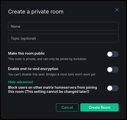 If you use the + to create a new room it will assume you are attempting to make a private room so the following screen will appear. In addition to making it public or blocking remote homeserver users it will also default to enabling encryption on the room. Encryption and remote homeserver are one-time options and cannot be changed after they are set.