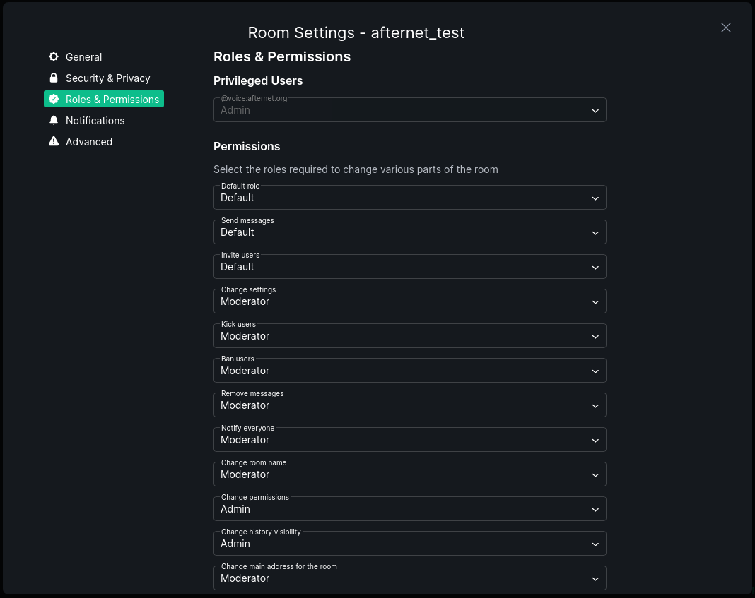 When you create a room you are by default a room Administrator but do be careful when changing power levels especially on yourself. If you were to lower yourself from 100 to anything less you cannot get 100 again and AfterNET staff will not be able to do so for you as well due to the federated nature of Matrix. You will need someone else in the room who is an Administrator to set you back to 100.