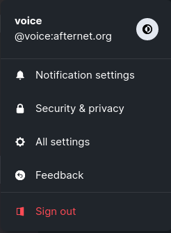 In order to manage your settings you can simply click on your username in the top left to bring up a menu. Notification and Security & privacy are both quick links to tabs under All settings, feedback is for the Element developers.