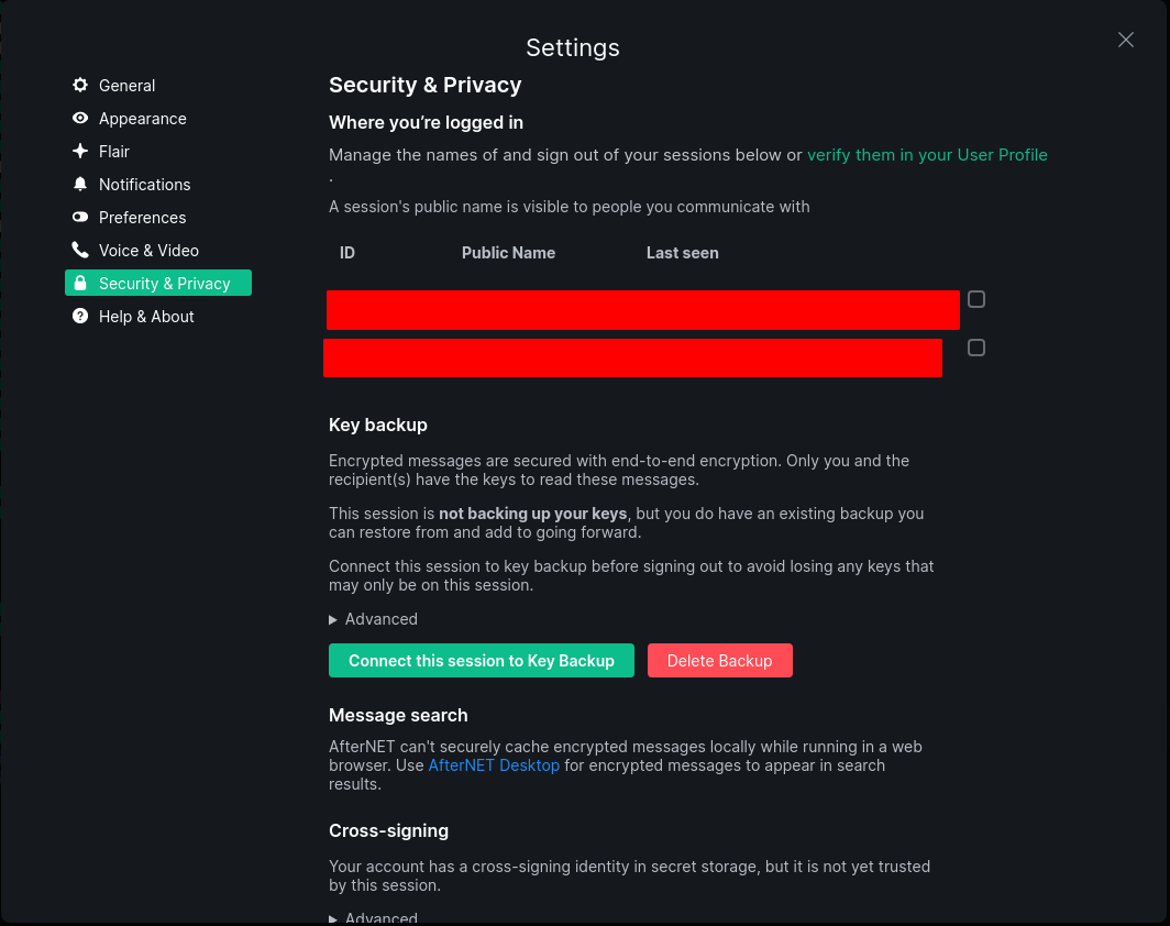 https://matrix.afternet.org/ is put in for the Homeserver URLBecause Matrix aims to be secure one of the first things it will do the first time you log in is to setup your security key. This will just be another password used in the event you need to restore your key should you lose it due to data loss or corruption. You can also use it to verify your login if you're doing a second login via another computer or mobile device (cross-signing).