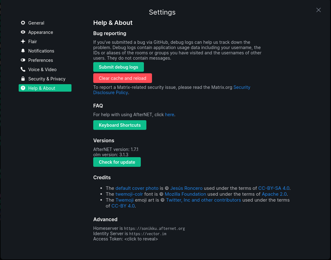 This tab also shows you the current version of Element as what as what servers are in use.